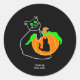 You can admire one of my Halloween drawings that I call, "Black Cat Pumpkin," this drawing has an adorable black cat holding onto a pumpkin with a silhouette of a black cat carved on the pumpkin. Now you can order, "Black Cat Pumpkin," on this round sticker, this makes the perfect Halloween greetings.