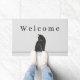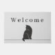 A artistic graphic silhouette of a black cat sitting on a light grey ledge. The word WELCOME is set above the image in trendy black font to welcome guests. The background is very light grey. The rectangle ledge element can be changed using the on screen edit tools to a colour that matches and coordinates with your front door or steps to create a unique custom designed look to greet your guests.