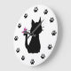 Enjoy this cute wall clock featuring a whimsical black cat silhouette with a pink butterfly on its tail and black paws substituted for the numerals. Personalize it, change the background colour to match your decor! This design looks best with lighter background colours.