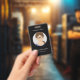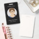 A Minimalist employee badge on a black background with a circle photo frame for company, small business, festival, press staff, etc. It comes with company name, employee's name, job or service on the front. On the back, you have a QR Code, 2 customizable text zones.