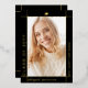 Modern gold foil and black Class of 2025 with photo graduation announcement. This photo Announcement is designed with a sleek and contemporary touch. The combination of black and gold foil creates a modern aesthetic, with the gold foil border elegantly framing the graduate's photo against a black background. The name and other important information are thoughtfully placed outside the frame, ensuring they stand out on the black background with their gold colour. On the back of the announcement, you will find the same stylish border along with another photo and all the essential details about the graduation. The cover has been designed using some assets from Freepik.com