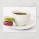 AssetID: 111720971 / Rosemary Calvert / Black coffee in white cup with two french macaroons on saucer, one green tea flavoured and the other blackcurrent flavoured, on a white background.