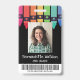 Vertical crayon teacher ID badge personalized with photo, name, grade beneath a row of crayons in a rainbow gradient. Kindergarten teacher ID badge with colourful crayons and a barcode.