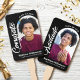 Stay cool while supporting your favourite grad as they receive their diploma, with this keepsake 2 photo hand fan. On the front, bold, graphic, white handwritten “congrats” script calligraphy and sans serif typography along with a photo of your choice in an arch overlay a dramatic black background. On the back, white handwritten “graduate” script calligraphy and sans serif typography, along with an additional custom photo, overlay black. Personalize the custom text with your grad’s name, school and class year. Matching invites, thank you cards, address labels, stickers and other graduation goodies are also available in this trendy and stylish collection. Guaranteed to preserve cherished memories of their special occasion!