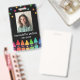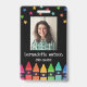 Vertical crayon teacher ID badge personalized with photo, name, grade beneath colourful stars and above a row of crayons in a rainbow gradient. Kindergarten teacher ID badge with colourful crayons and stars.
