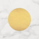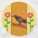 This table confetti has large circles that have a black crow standing on a tree branch with two abstract red roses on each side on a yellow background. Medium circles are yellow with abstract red and yellow centre roses, small circles are gold.
