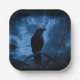 Paper plates with an image of a black raven at night perched on a tree branch with runes above which says "black raven".