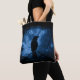 A tote bag with an image of a black raven at night perched on a tree branch with runes above which says "black raven".