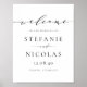 Bienvenue à vos hôtes mariages avec ce panneau d'accueil mariage romantique. Ce panneau d'accueil mariage personnalisable présente un script noir dainty avec typographie classique.