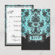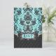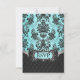 Black Damask Blue Wedding RSVP (Response) Cards---match the invitations & entire suite found below on this page. The front features a pool blue blue) & black chandelier damask print on the top half of the card's front, followed by a black pintuck print on the back for elegance. Change the RSVP wording on the back to whatever you want by clicking the orange customize button below the card demo above.