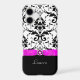 This case features pretty giant black damask over white on the top, with a solid black bottom that is separated by a bright hot pink faux ribbon with a faux jewel centre. Add your own name in white on the solid black bottom, and you have an elegant case that is sure to grab attention! **Please note -- the image is printed on the case, which contains no actual fabric, ribbon or jewel substance.**