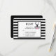 Wedding or other event RSVP card with a black deer head with large antlers. Geometric lines inside the face of the deer adds a creative touch. Colourful pink flowers and mint green leaves form a pretty floral bouquet below his head. A mountain range sketch placed amongst the flowers also adds to the rustic country feel. Background is a black and white striped pattern.