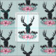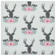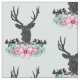 Fabric pattern with a black deer head with large antlers. Geometric lines inside the face of the deer adds a creative touch. Colourful pink flowers and mint