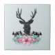 A ceramic tile with a black deer head with large antlers. Geometric lines inside the face of the deer adds a creative touch. Colourful pink flowers and mint