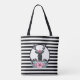 A tote bag personalized with monogram initials. Designed with a black deer head with large antlers. Geometric lines inside the face of the deer adds a creative touch. A colourful pink flower and mint green leaves form a crown on his head and a floral bouquet also rests beneath his head. A mountain rangesketch placed amongst the flowers also adds to the rustic country feel. Background is a black and white striped pattern.