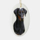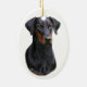 A black Dobermann Pinscher with natural ears (uncropped) on an ornament. To change the background colour click Customize>edit>background and make it suitable for the holiday or decor of your choice.