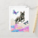 Cute and whimsical watercolor painting of a black pitbull dog jumping over rainbow coloured clouds with butterflies.