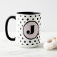 This mug features a pattern of black dots on a white background with a framed custom monogram on a pale pink background. Click Personalize this Template to easily personalize the monogram and further customize the colours, font and add additional text, if desired.