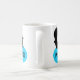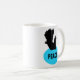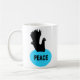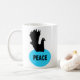 This mug features a black silhouette of a fancy dove with a white eye, sitting on a blue oval shaped nest with the word peace written in black in the centre of the nest. The design is on both sides of the mug. There are lots of different colours and styles of mugs available that feature this design.