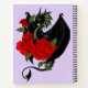 A black and green dragon sitting amongst red roses in a backdrop of lavender