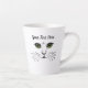 This Latte mug has a black etched drawing of a cat face with long whiskers and vibrant green eyes. Customize your text with the template.