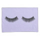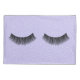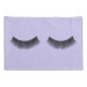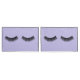Pair of black eyelashes on white pin dots and a pastel purple background.