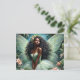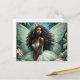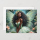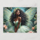 This postcard features a dark brown-skinned fairy girl with pointy ears and long curly hair surrounded by lush tropical foliage and peach-colored lilies. Her green gossamer wings and elegant leaf-inspired gown create an ethereal and magical scene that captures the beauty of nature and fantasy combined. Perfect for fantasy black girl art lovers, fairy enthusiasts, and collectors of fairycore ephemera.