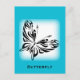 A pretty and ornate design of a black butterfly with swirly shapes and patterns. Has a tribal tattoo look to it. The background is white with a soft misty bright blue border.