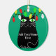 Black fat cartoon cat with green eyes. Cute cat character. Custom ceramic ornaments for Christmas decor. Green background. Edit text to customize. Gift idea for cat lovers.