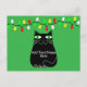 Black fat cartoon cat with green eyes. Cute cat character. Custom postcards for Christmas. Green background. Edit text to customize. Gift idea for cat lovers.