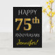 This simple, personalized wedding anniversary greeting card design features the message "HAPPY 75th ANNIVERSARY", with the "75th" having a faux gold-like appearance. The front also features a personalized name, and a black background. The inside features a custom wedding anniversary greeting message. It could be given to a husband or a wife in celebration of the couple’s seventy fifth wedding anniversary. [~Z0000076]
