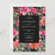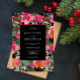 An elegant and enchanting watercolor floral black Christmas wedding invitation. Which features watercolor greenery olive and eucalyptus leaves. And red and orange flowers and holly berries on black background. Grab it now and make it yours so your invites truly engaged!