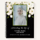 This Stylish Celebrating of life guest book design features a watercolor white roses and greenery foliage on black background with green and black elegant text. Add photo in greenery frame. The reverse side of this guest book is simple black coloured with chic white flowers .