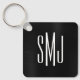 A simple three letter monogram design on a rounded square two-sided keychain.