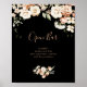 This black formal royal floral wedding open bar sign is perfect for a modern wedding. The design features watercolor pink, blush, and white elegant flowers with emerald green leaves.