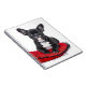 A photo of a lovely black bulldog on a red cuchion