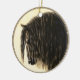 Black Friesian horse with a long wavy mane showing warm yellow highlights from late afternoon sunlight. Realistic artwork created from an original oil painting by equine and wildlife artist Crista S. Forest.