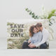 Geometric retro art deco black text over an engagement photo wedding save the date.