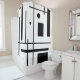 This custom shower curtain was created using one of my art prints of black geometric shapes on a background of white. Created by artist Kirt Tisdale.