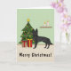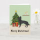 Destei's original cartoon illustration of a black colour German Shepherd breed dog. The dog is standing by a festive Christmas tree decorated with red and yellow ornaments, a white pearl garland and a yellow star that is placed on the top of the tree. There are also two wrapped presents by the tree. The floor colour is beige and the background wall colour is light green. There is also a personalizable text area that now reads: "Merry Christmas!".