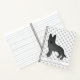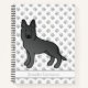 Destei's original cartoon illustration of a cute black German Shepherd breed dog. There is also a personalizable text area for the title of the notebook. The background has a pattern of grey dog paw prints.