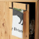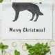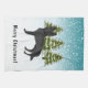 Destei's original cartoon illustration of a black colour German Shepherd breed dog. The dog is placed in a winter scene with three green fir trees and falling snow. The background is a blue to white gradient giving the design that cold winter day look. There is also a personalizable text area that now reads: "Merry Christmas!".
