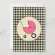 An invitation featuring a black gingham background over warm beige with hot pink trim. Personalize the brown font text with details of your event. Opposite side is solid gingham with a hot pink baby carriage inside a matching circle shaped frame.