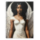 Notebook features celestial being artwork of a beautiful melanated woman as a heavenly angel with large, white wings wearing a white dress.
