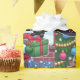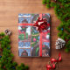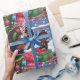 Whimsical wrapping paper design featuring an animated Black girl in festive attire, her face lit up with joy as she proudly showcases her newly unwrapped Black baby doll. Gently falling cartoon snowflakes and festive elements create a playful backdrop, capturing the magic of gift-giving during the holiday season.