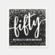 Personalized Fifty 50th Birthday Paper Party Napkins. These celebratory napkins feature the word "Fifty" big across the center in bold script, with "Name's 50th Birthday" displayed at the bottom in a clean sans serif font. Faux silver glitter sparkle confetti decorates the edges for a festive, shimmery touch. Designed in a simple yet stylish black and white theme, this minimalist layout keeps the focus on the milestone while adding a hint of elegance to your party. Fully customizable, you can change the font and background colors to match any birthday style or theme.