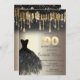 Elegant black and gold glitter drips, and black dress on a gold background. Perfect for a stylish women's bday celebration. Personalize with your own details.