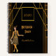 An art deco style notebook in faux gold and black. Decorated with a 1920's style flapper girl and an art deco style frame. Templates for a year, text and a name.