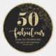 Personalized "Fifty and Fabulous" black and gold birthday round party favor label for with simple patterns, simulated glitter and script handwriting font. Customized with name, birth year/birth date, or short messages of your own.