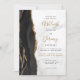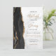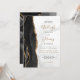The left-hand edge of this elegant modern wedding invitation features a black watercolor agate border trimmed with faux gold glitter. The customizable text combines gold-coloured handwriting script with black copperplate and italic fonts on a grey and white marble background. The reverse side features a matching black and gold agate design.